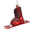 Glazen kerstornament in de vorm van skischoenen met ski’s. De schoenen en de ski’s zijn wit van kleur. De bindingen van de schoenen zijn zwart. Op de schoenen zijn witte glitter details aangebracht.